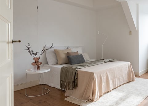 Wij adviseren u om het bed op te maken met beddengoed, kussens en eventueel een sprei voor een nog mooier resulaat.